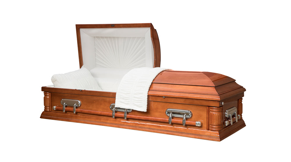 Our Tranquil MDF casket range is finished with a VENEER on top in various designs and colours. This allows the caskets to look and feel like a solid wood casket, but without the price tag.